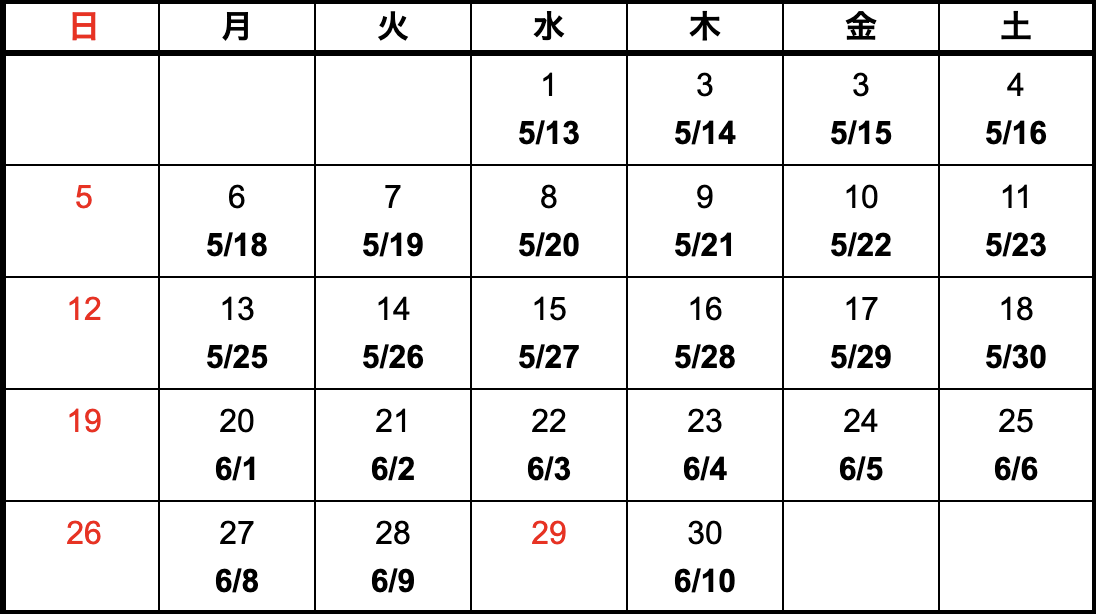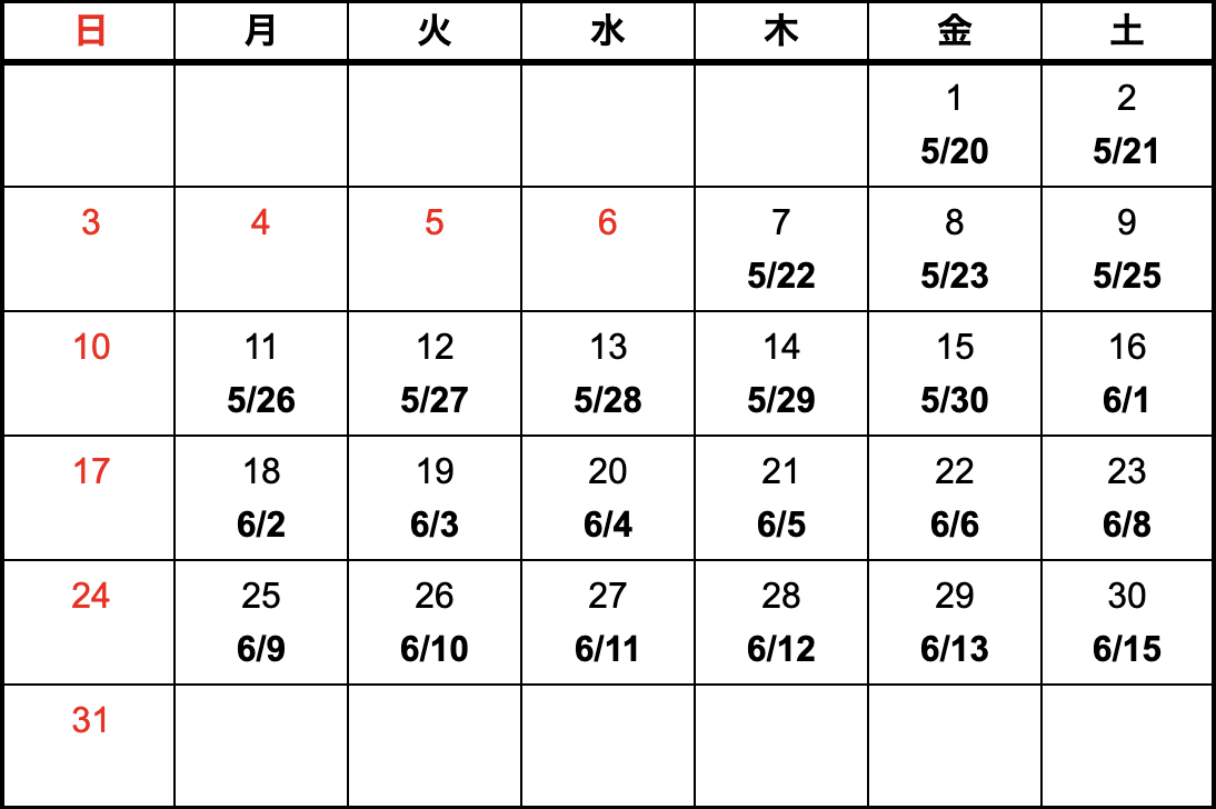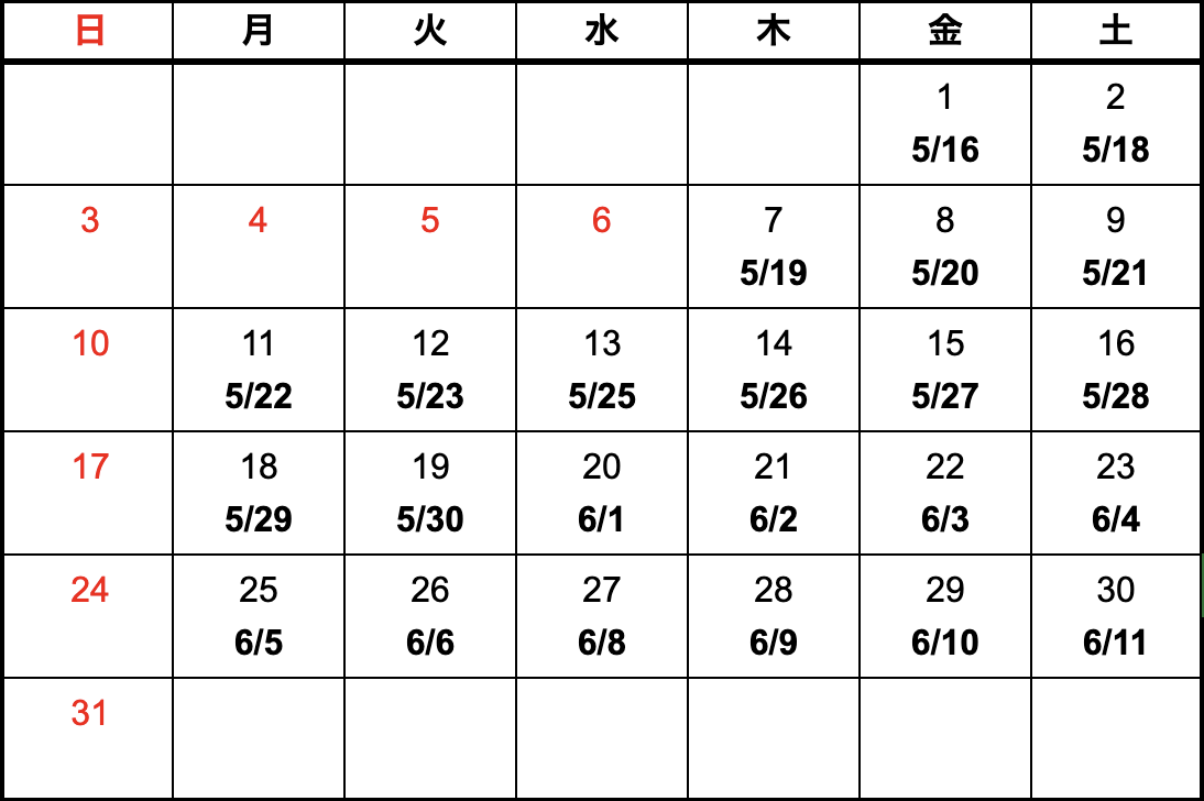 模型、指示書がASOに到着した日(午前中到着)をカレンダー上段、納品予定日を下段に記載しています。