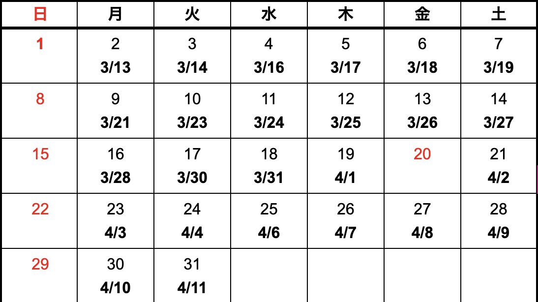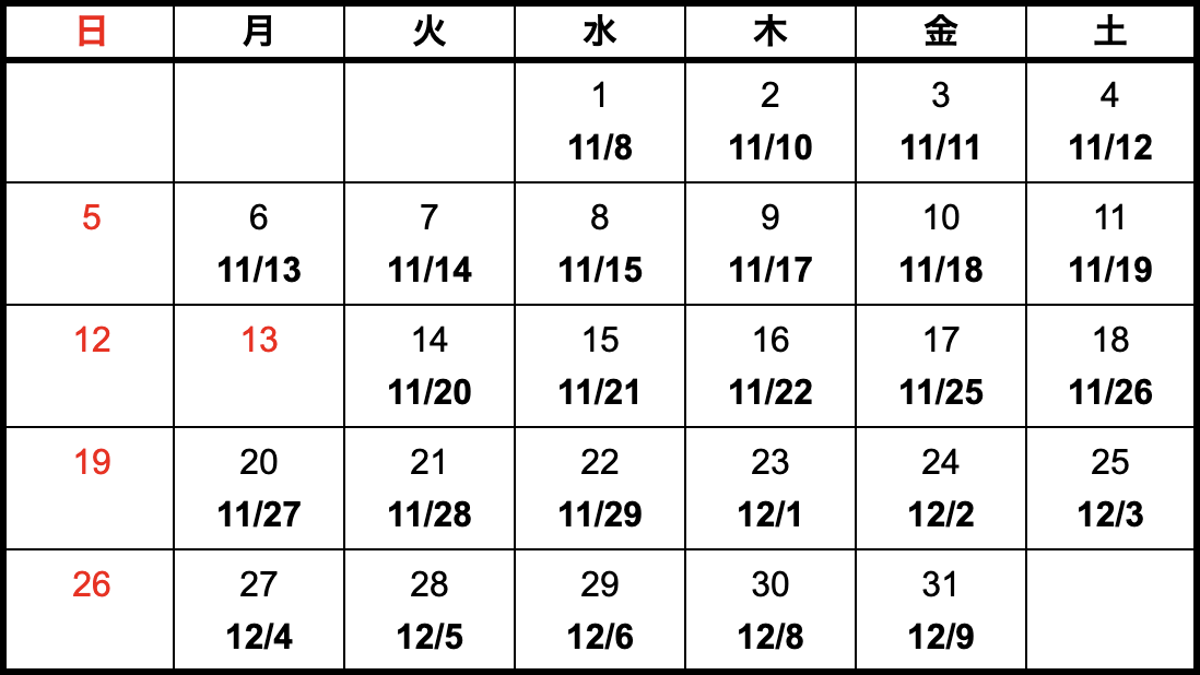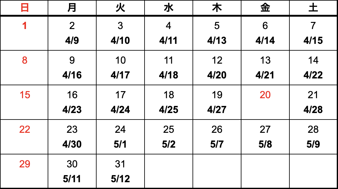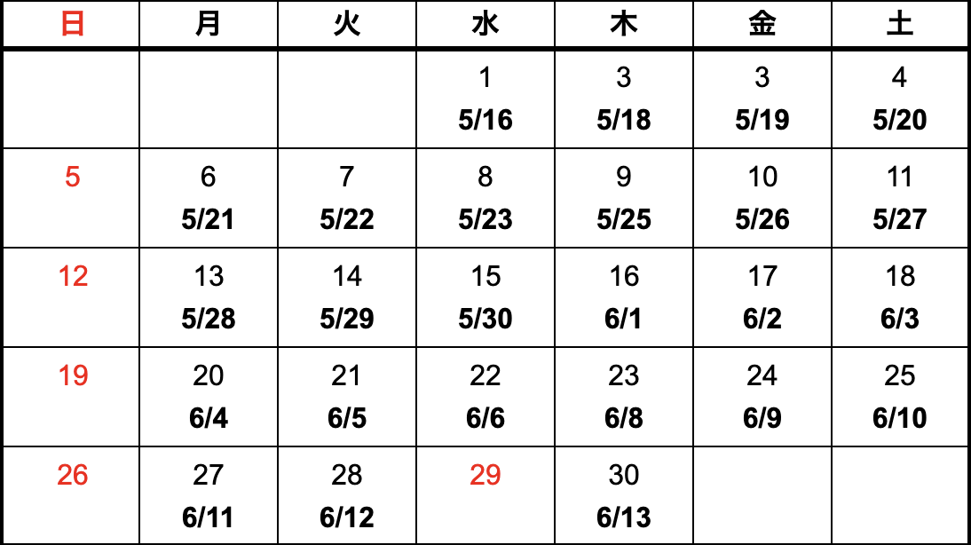 模型、指示書がASOに到着した日(午前中到着)をカレンダー上段、納品予定日を下段に記載しています。